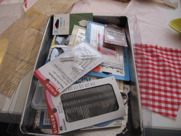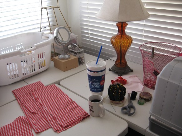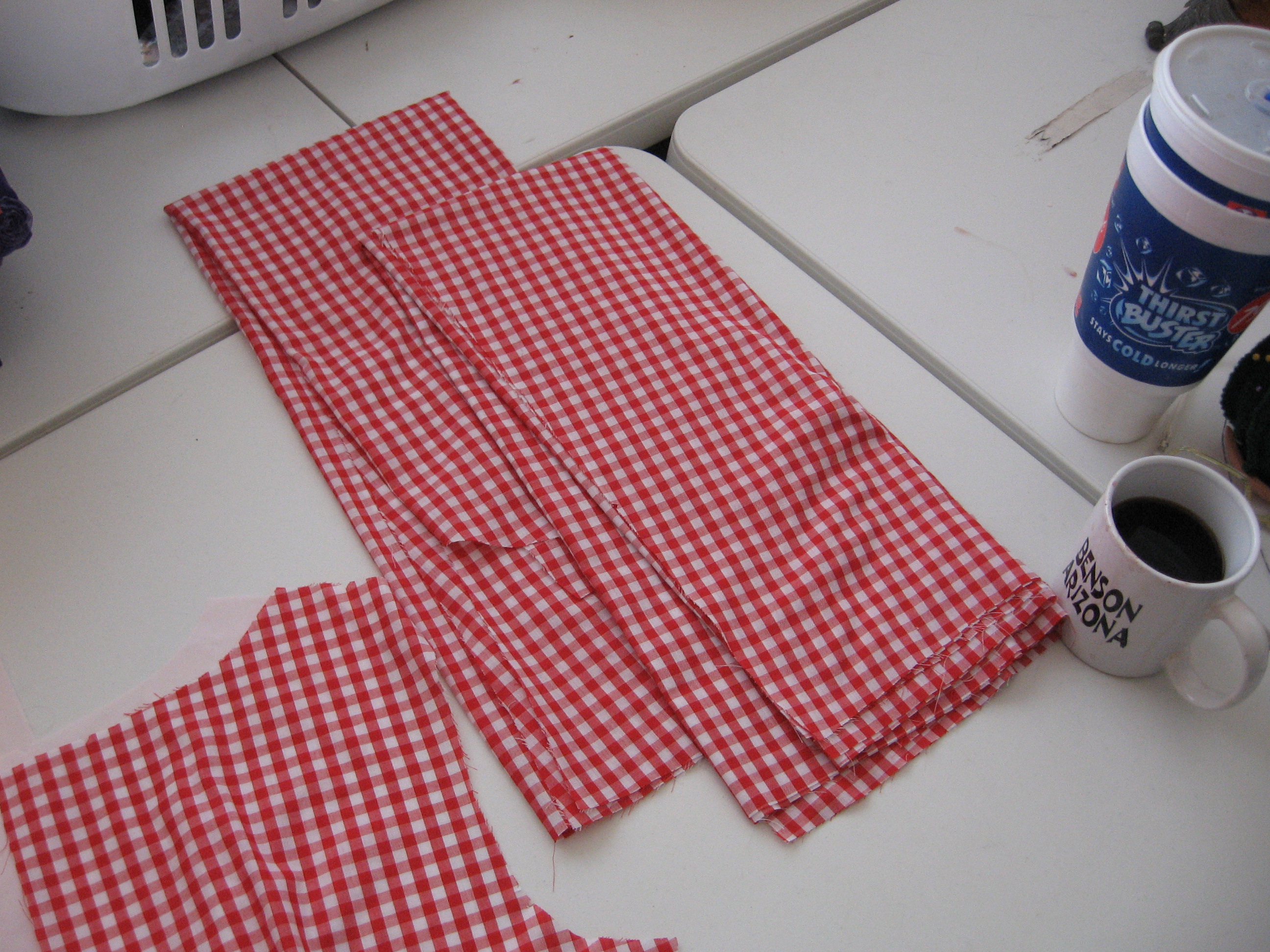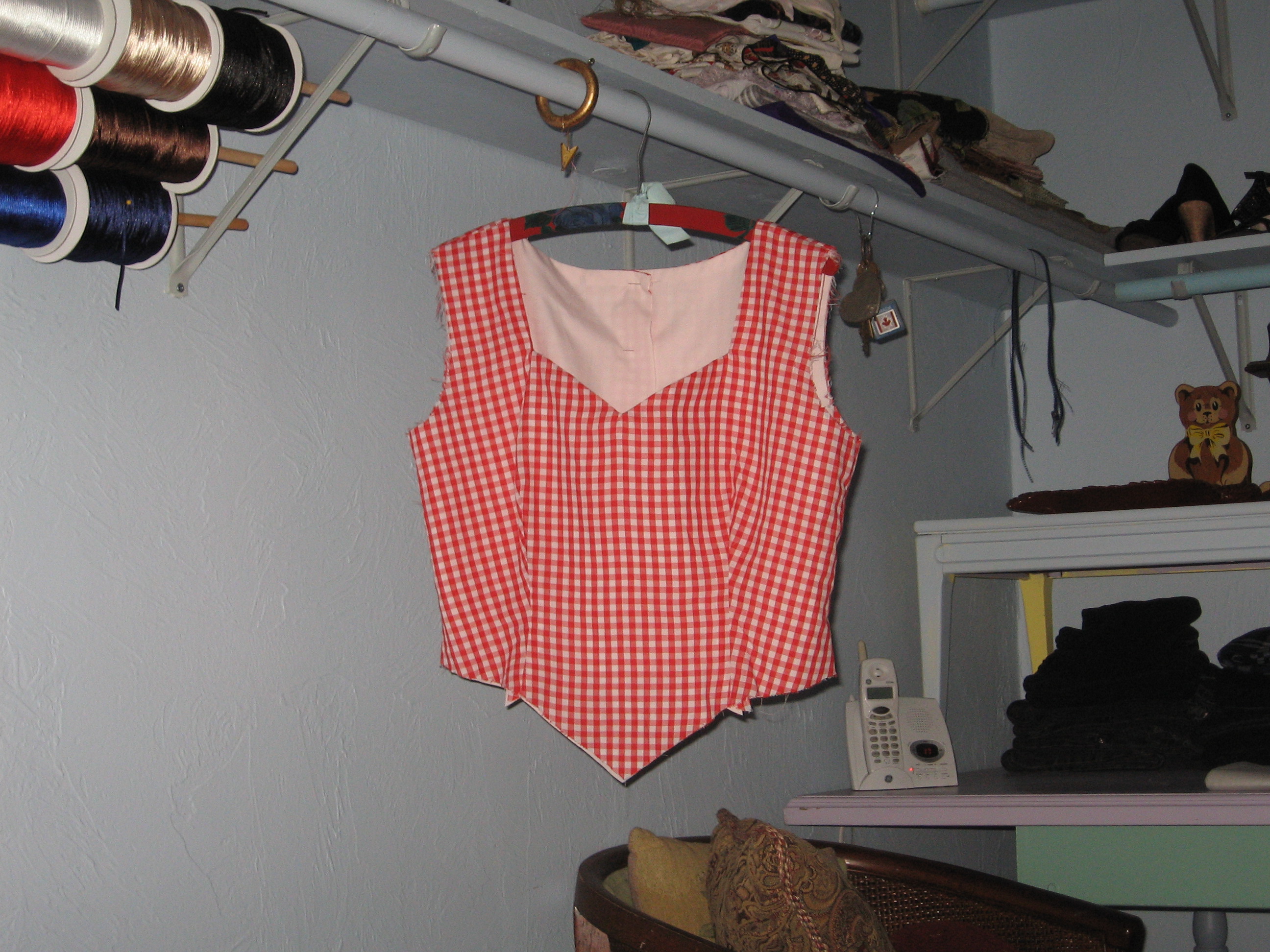 With her last bit of monopoly money, (before she got the bad noose from the bank), while she was over tending to her friend who just had triple by-pass/valve replacement surgery, and she was in a higher-end area of the world where people still seem to be alive and kicking, looking like all is well with the state of the world, some of it rubbed off and she felt a splurge of less than hopelessness, picked up six yards of red gingham, several very pricey patterns (when did that happen?), and low and behold, seven, 7 pairs of (Support the poor people in China), pretty darn nice looking, animal friendly strappy shoes from no less than the Payless.