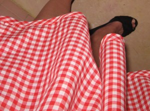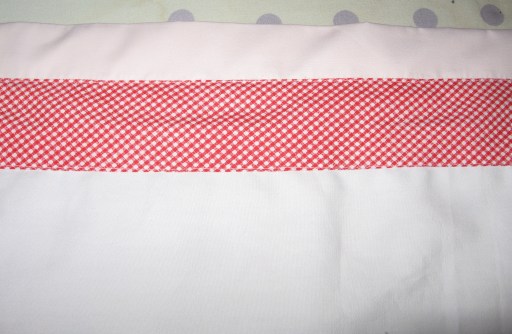 It struck her that a pocket for a belt or tie to traverse through might be a novel idea. Something different, then the fullness could be adjusted for a smaller or larger waist size. And why not in a small version of the red gingham, especially since she had a wrap of it in her binding collection. Easy, peasy!