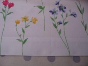 This day she found a border print that had been forcing itself to the top of the heap for some time. She cut it in half width wise thinking she might just be able to make one to keep and one to sell. It was a little on the skimpy side for the fullness factor (minimum 2.5%), but she knew she could come up with some kind of creative amendment if need be.