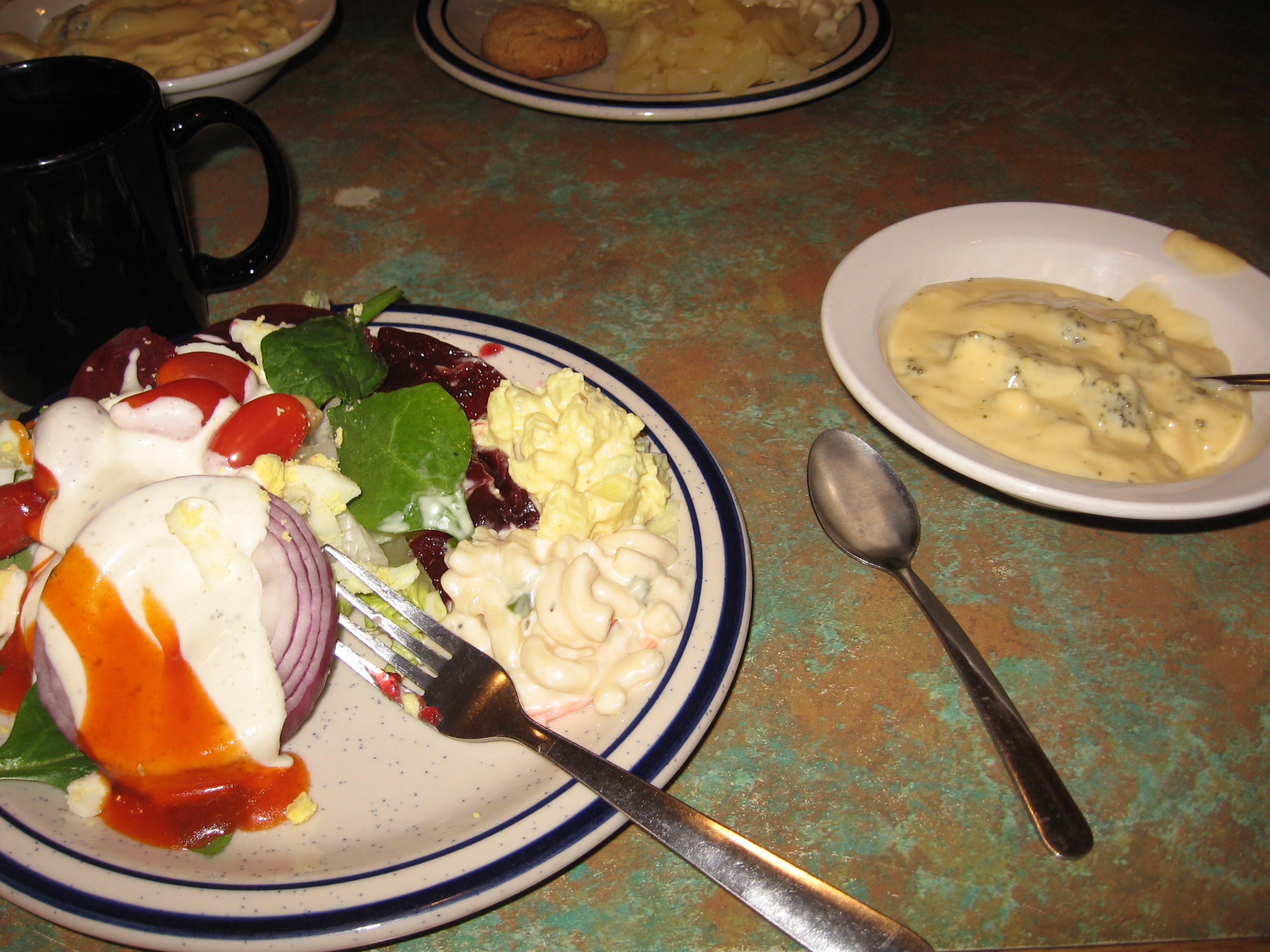 Her plate was balanced with color. Her friend’s plate…not so much, at least not his first plate…