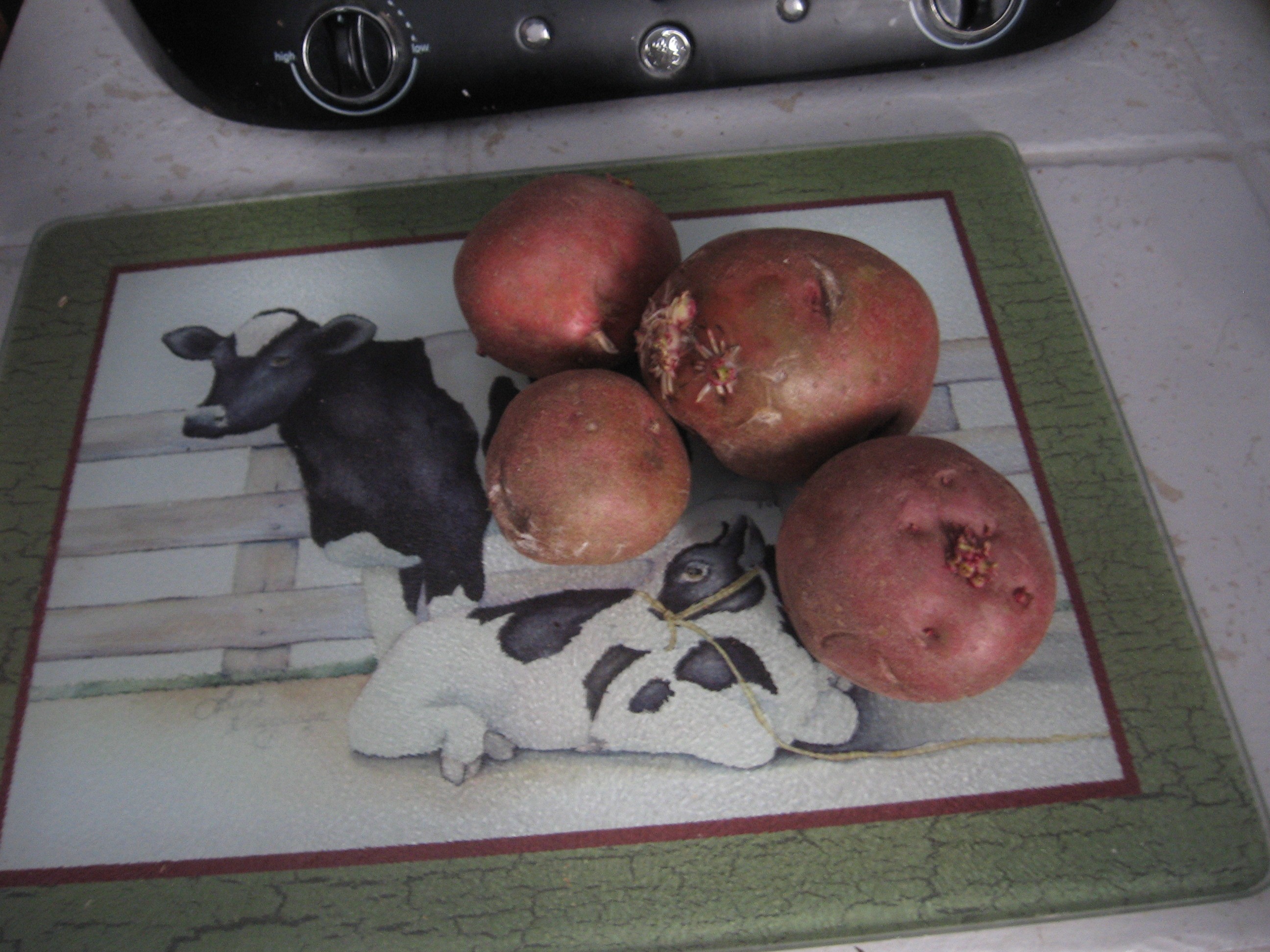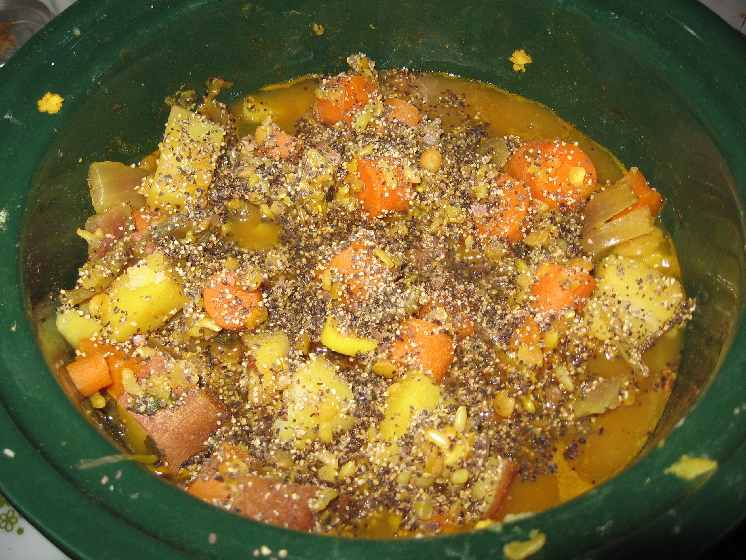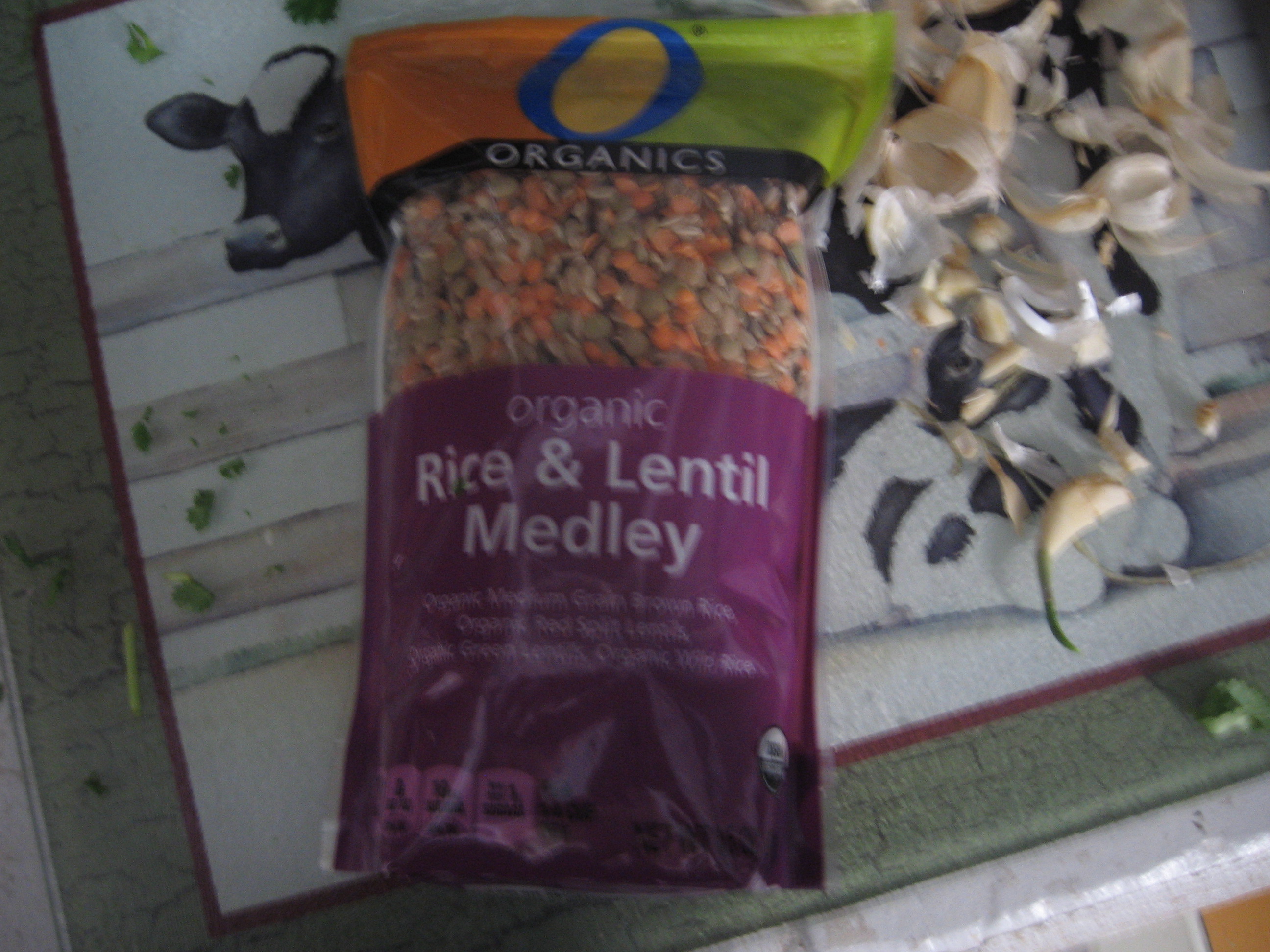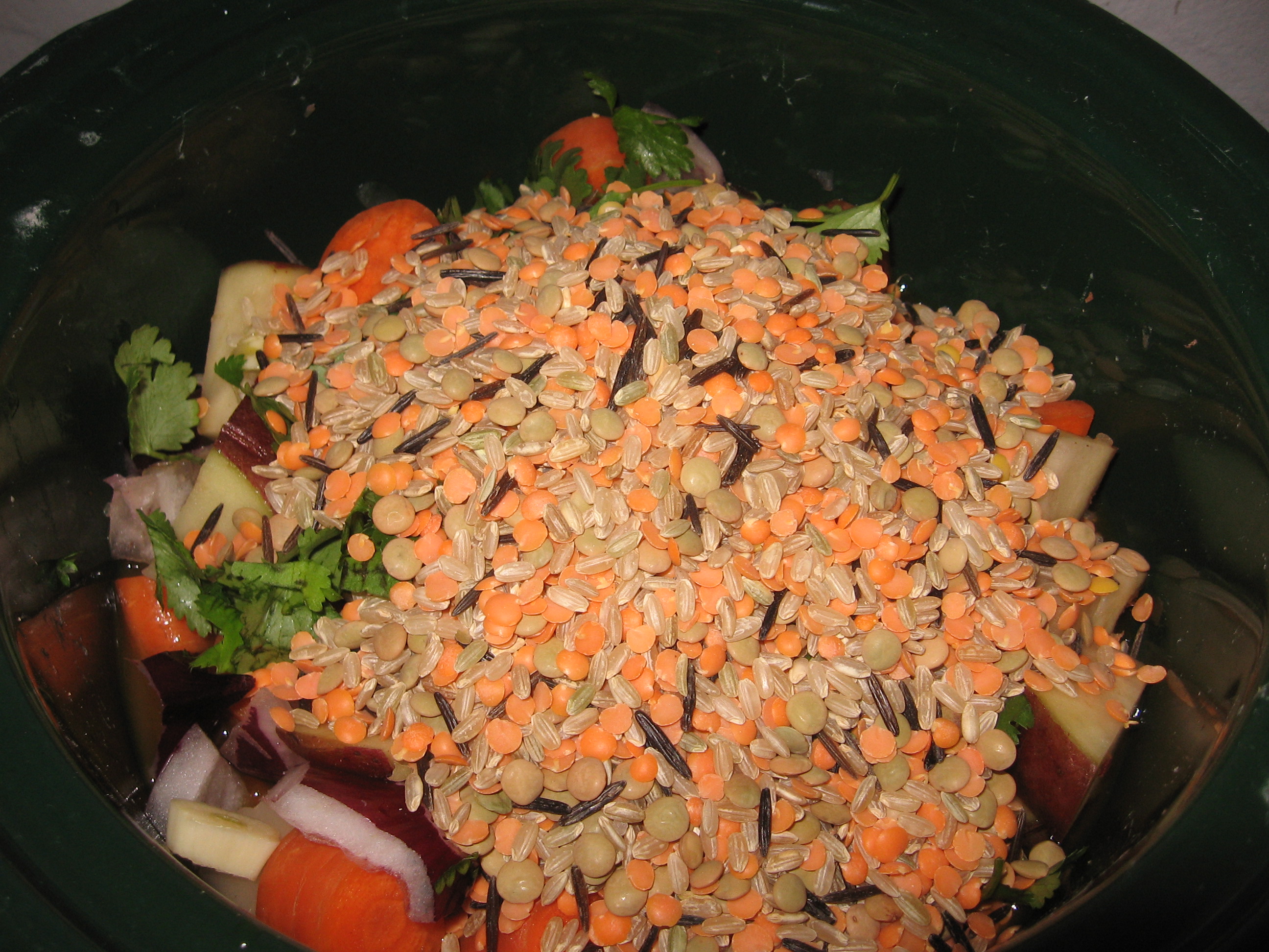 Ms. SpoolTeacher has to make the most of what she has, so a stew is a great option to stretch her food budget and at the same time, utilize things that might otherwise go to waste, (like a hunk of onion that isn’t good for dicing for her Super Anti-Inflammatory Salmon Salad/Dip). She’s made this once before but she decided that she wanted to add a few new ingredients, like mushrooms, onions, garlic and cilantro. This is a crock pot recipe so she added all the ingredients that take awhile to soften first, most everything. She adds the mushrooms a little later, since they cook quickly, as well as a can of precooked black beans and a can of chile beans in sauce that will only need enough time to heat within the stew. Hence: Crock Pot Kitchen Sink Stew. Just about everything but the kitchen sink goes into it, eh? Criteria? All ingredients must be organic. She leaves the skin on the potatoes. Vitamins right? And she likes the added texture. The skins cook off for the most part and float as a separate entity. Note: Her Safeway Market had the soup stock and the beans marked down but they were missing from the shelf. She went back two different days looking for them, and finally asked for the check-out clerk to mark down an alternative brand to the same price. The clerk obliged without flinching, though she did get flustered to figure out how to do it. (Ms. SpoolTeacher’s thought was that her request might inspire the associate to implore her manager to do a better job of keeping the shelves stocked with on-sale items)(This is a frequent occurrence and Ms. ST thinks it is a strategy to discourage customers and make them buy the higher priced items)(conspiracy theory?). Anyway, so… Gather ingredients: Red Potatoes Carrots Red Onion Garlic Cilantro Himalayan Pink Sea Salt Pepper Turmeric Rice and Lentil Medley Baby Bella Mushrooms Can Black Beans Can Chili Beans in Sauce Wash/scrub potatoes, leave the peels on or scrap them off if you prefer. Cut off sprouts if there are any.