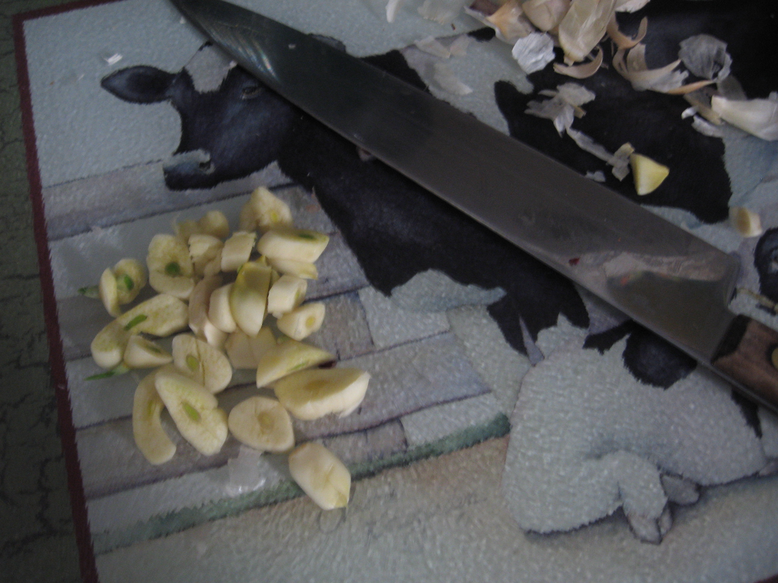 If you don’t already know, hold the knife over the clove and smash your fist over it to break the peel and it will practically fall off. (Or visit here, to see how this “chef” does it in less than 10 seconds.) Cut off just the hard end where it was originally cut from the stem.
