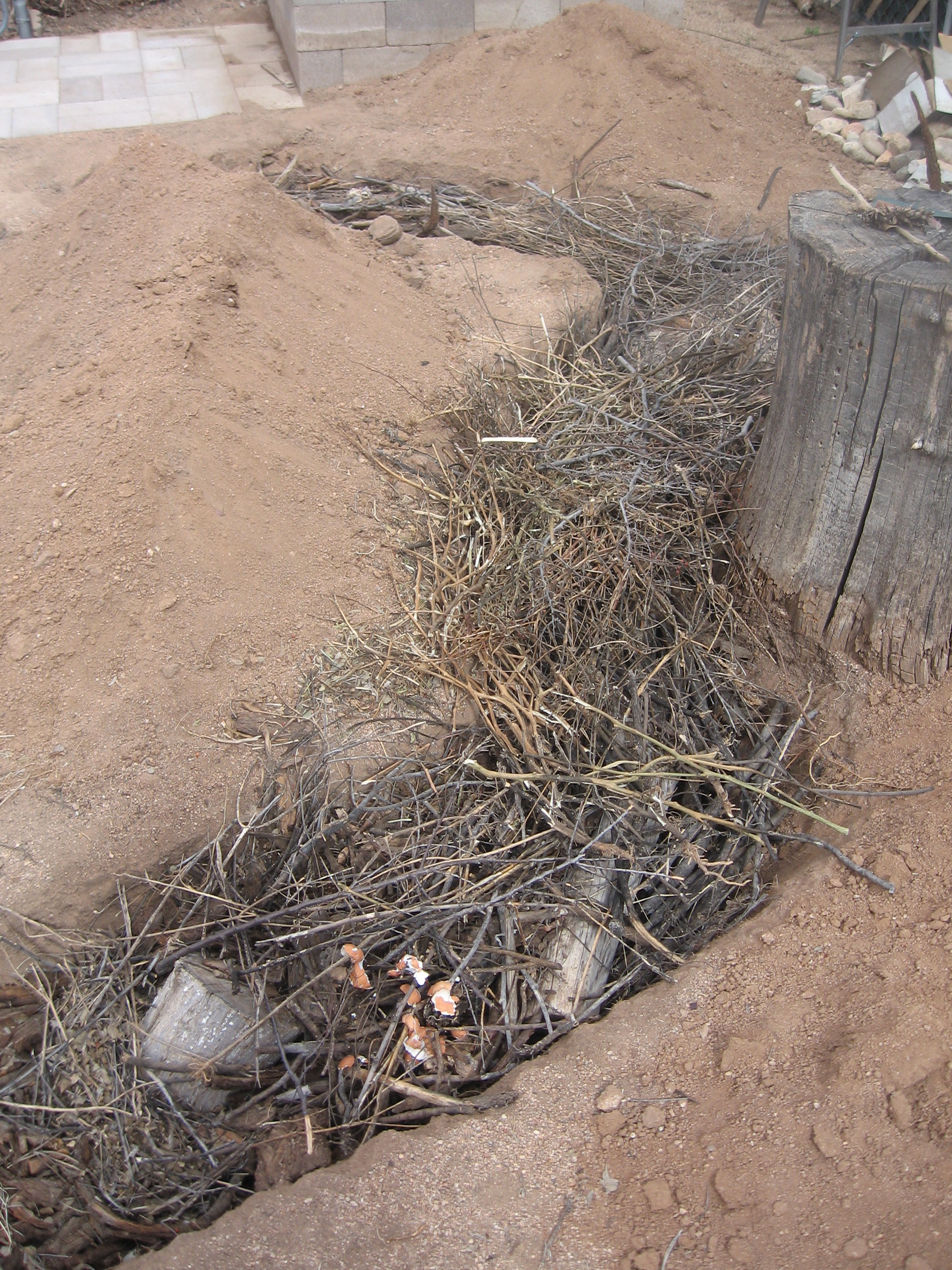 In between digging the trench and building the Hugelkultur mound layers, she leveled the landing area at the front gate and installed pavers. She does this by eye and the feel of hand, and right over the dirt, no sand. She likes things a little Wabi-sabi.