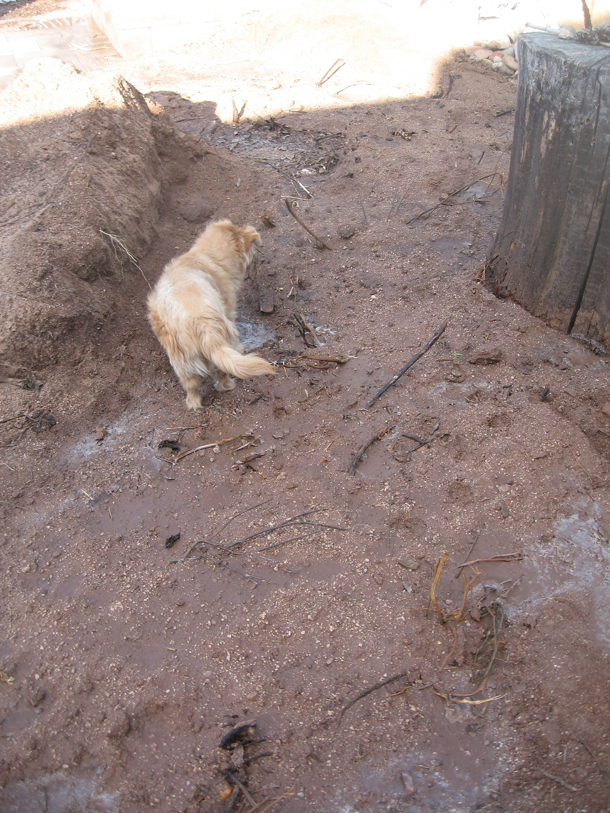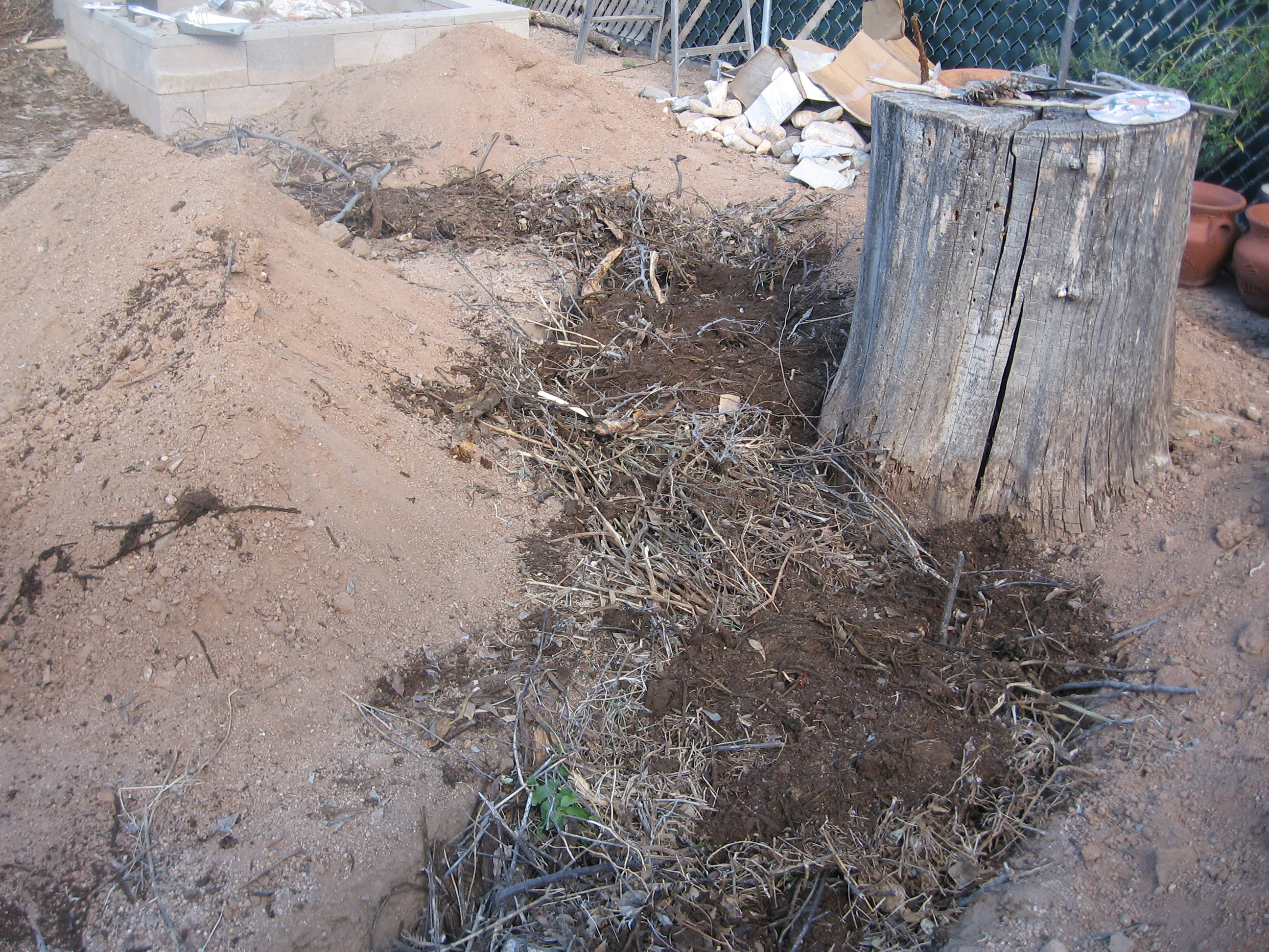 She then watered it in, added some of the excavated trench dirt and watered it some again to level it out. She will continue adding the trench dirt, which should create some kind of mound. There is a slight threat of rain tonight, so she’s waiting for that just in case.