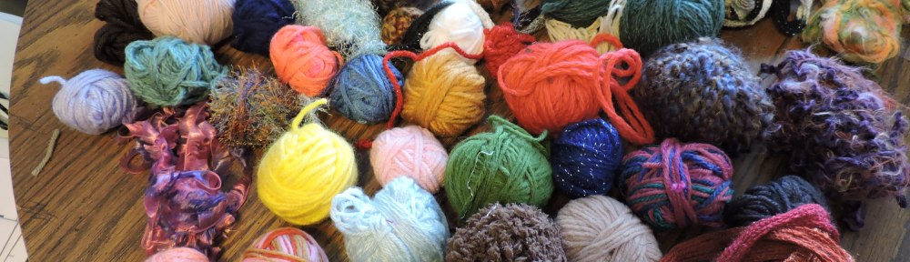 Soon enough, a hoard was brought from two thrifts to consider for this project along with the Walmart offerings. At first, it didn’t seem desirable to use second hand yarns of which there was no way to know of where they came, (animals, hair, smoke), but realizing the thing can be washed — so it advanced.