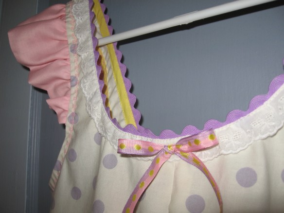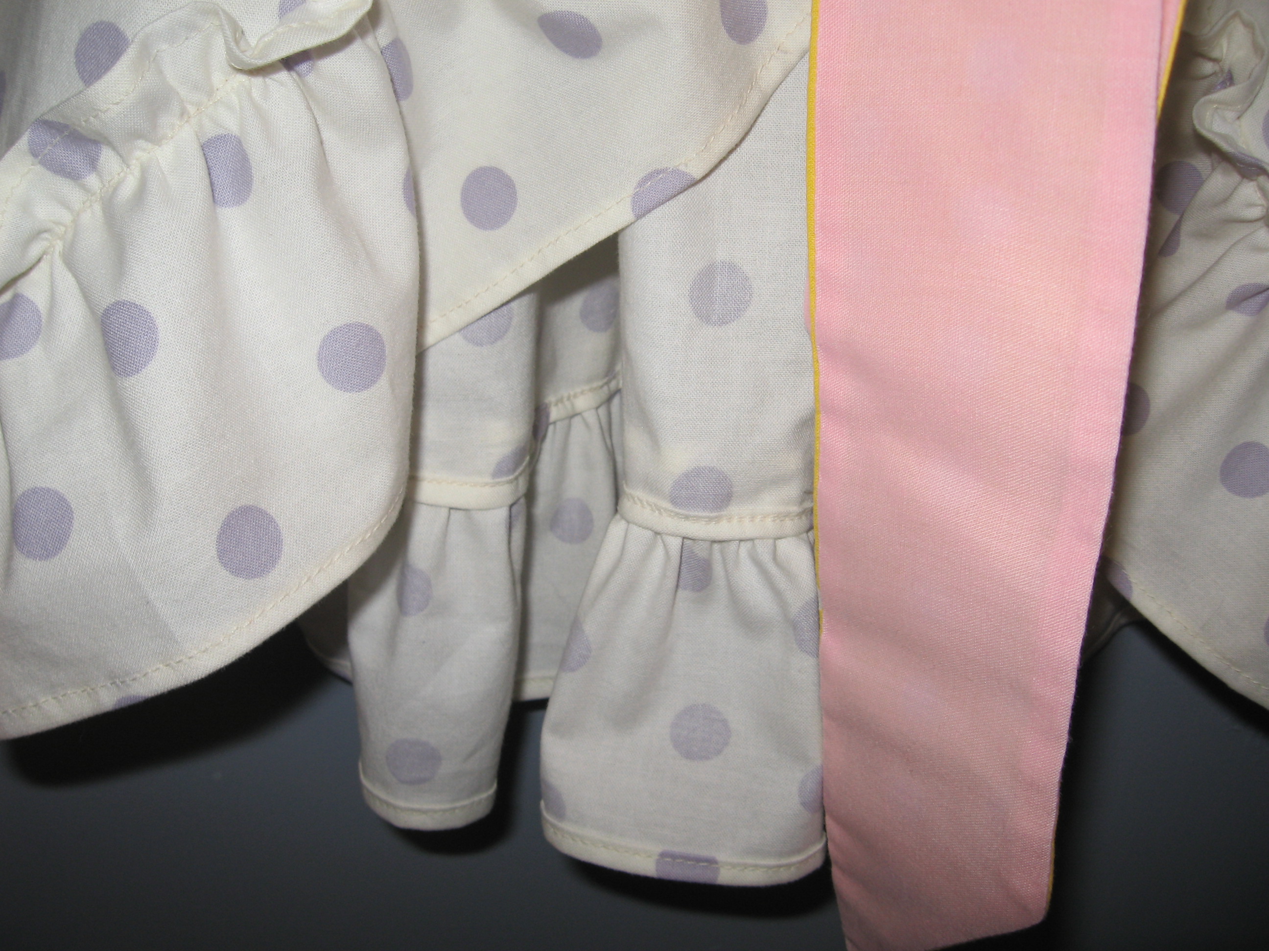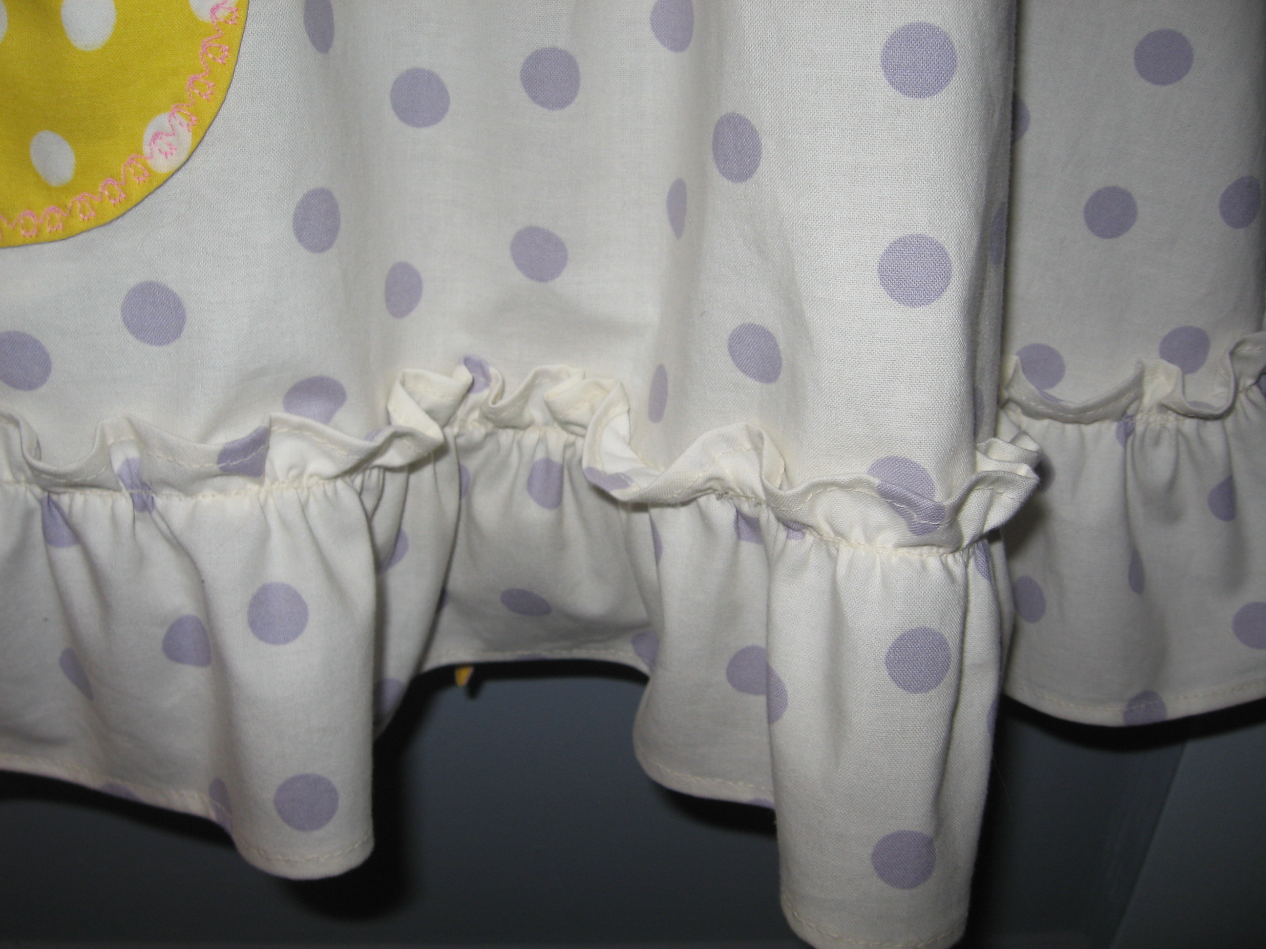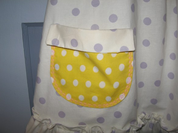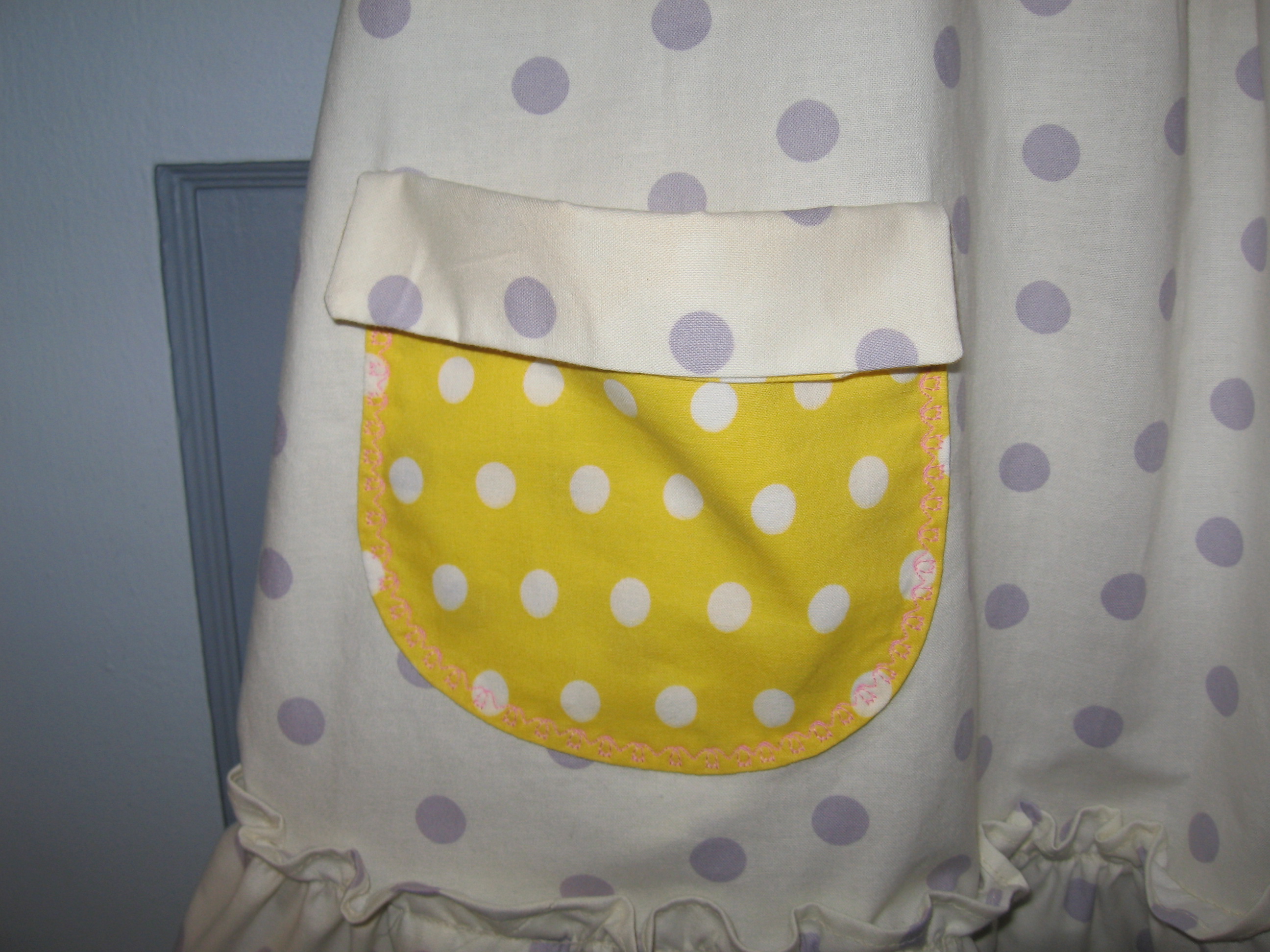 She originally made this little “Springing From The Hem” apron and hadn’t yet made the belt to slip through the waistband gather-able casing. She had been using a belt to show it’s capabilities. Finally, lately, she took a length of green plaid cotton and married it to a width of red gingham, wide bias tape to make a “drawstring” for the waist. Well…what was she thinking! She had to make it again to make it long enough…